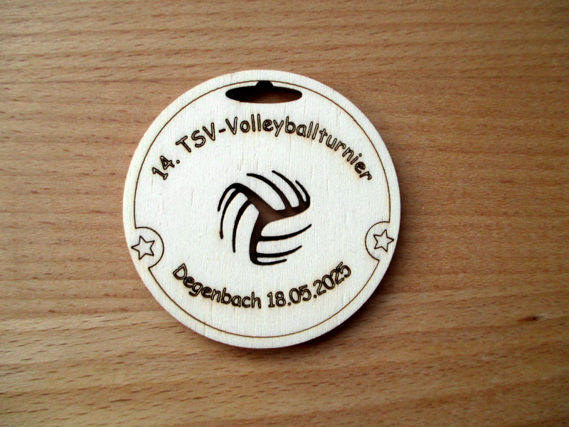 Unsere Volleyball-Medaillen stehen für Leistung, Teamgeist und Nachhaltigkeit. Mit einem Durchmesser von 6 cm aus hellem, unbehandeltem Sperrholz und einem stilisierten Volleyball als Loch in der Mitte bieten sie einen besonderen Reiz und Platz für individuellen Text, auch auf der Rückseite.
