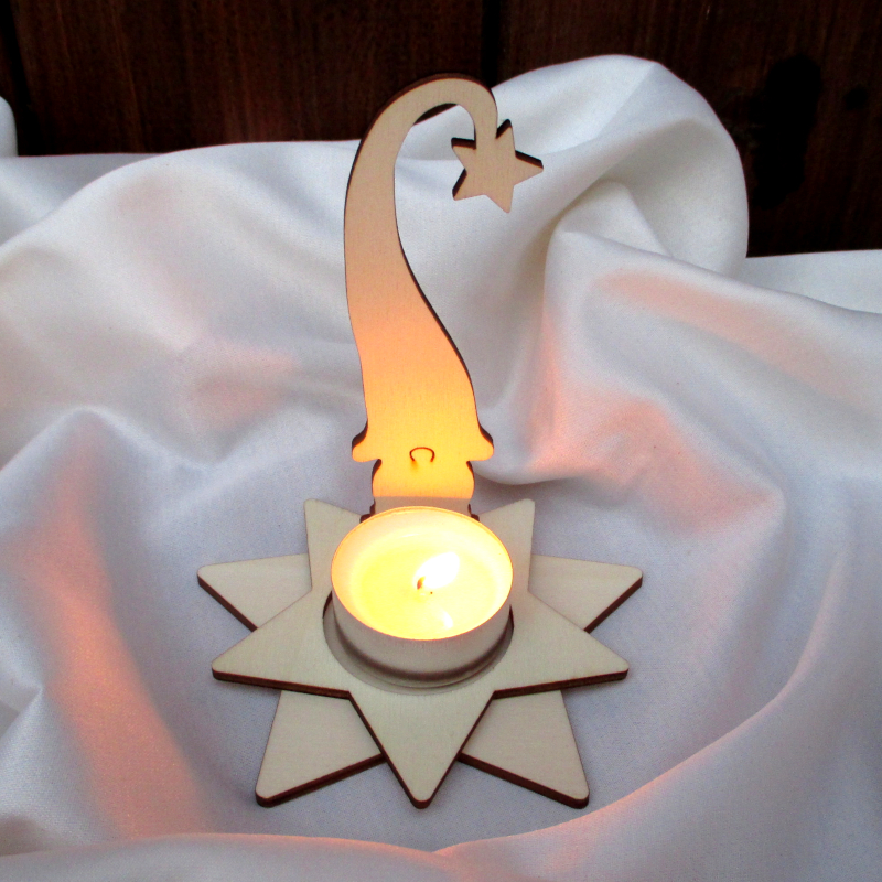 Kerzen-Wichtel Eberhard bringt mit seiner Stern-Halterung für Teelichte eine der angenehmsten Lichtquellen und einen warmen Glanz ins Dunkel der Herbst- und Wintertage.