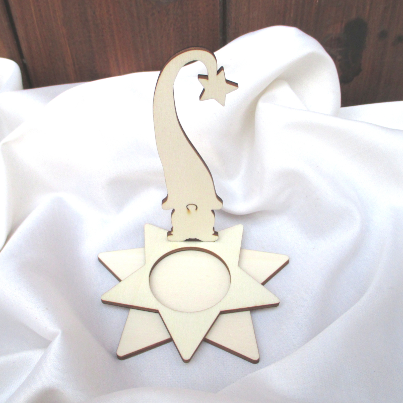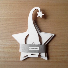 Das Steckset besteht aus drei Teilen: der 11 cm große Wichtel Eberhard wird erst in den Schlitz des 9 cm breiten oberen Sterns gesteckt (das ist der mit dem Loch für das Teelicht), dann in den Schlitz des gut 10 cm breiten unteren Sterns - FERTIG!
